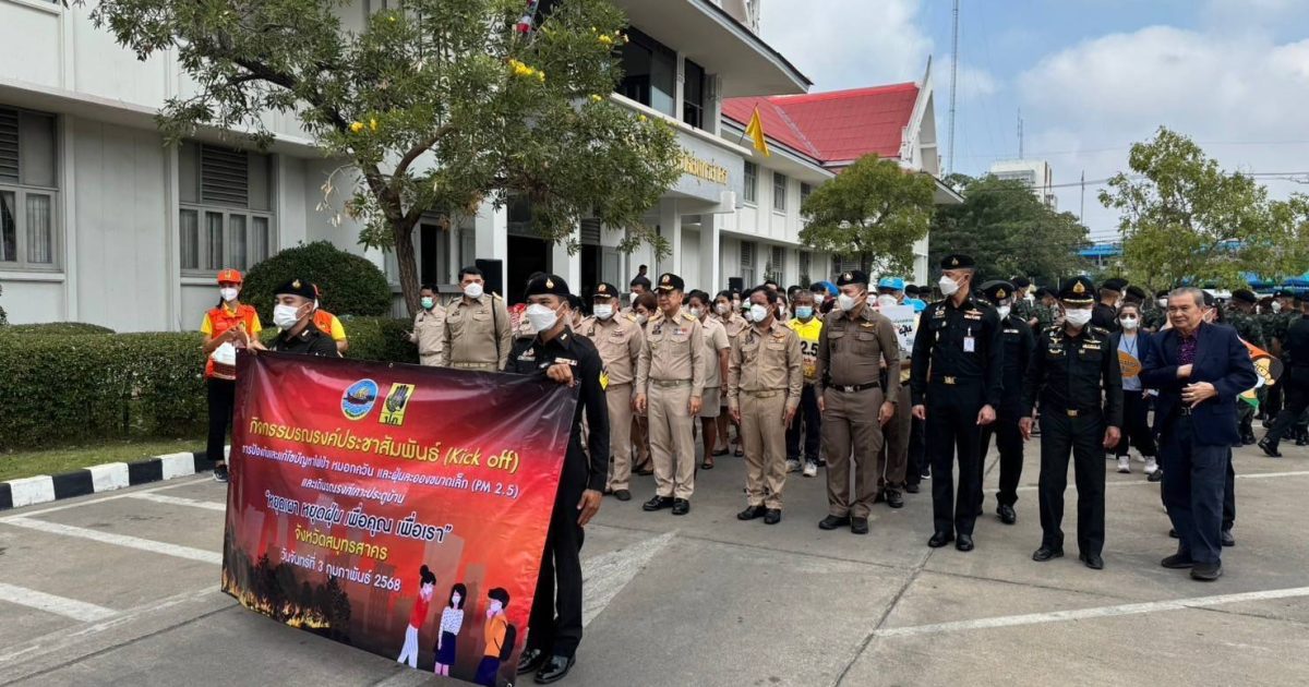 วันนี้( 3 ก.พ. 68 ) เวลา 10:00 น. พ.ต.อ.ชาญฤทธิ์ ทรัพย์สมบัติ รอง ผบก.ภ.จว. สมุทรสาคร พร้อมด้วย พ.ต.ท.สมชาย จงใจรัก สว.ธร.สภ.เมืองสมุทรสาคร,พ.ต.ต.เมธี บัวซ้อน สว.จร.สภเมืองสมุทรสาคร ข้าราชการตำรวจจราจร ข้าราชการตำรวจจิตอาสา ร่วมกับส่วนราชการในจังหวัดสมุทรสาคร ร่วมกิจกรรมรณรงค์ประชาสัมพันธ์( Kick Off) การป้องกันและแก้ไขปัญหาไฟป่า หมอกควันและฝุ่นละอองขนาดเล็ก (PM 2.5) และ เดินรณรงค์เคาะประตูบ้าน” หยุดเผา หยุดฝุ่น เพื่อคุณเพื่อเรา” พร้อมแจกแผ่นพับประชาสัมพันธ์และหน้ากากอนามัย