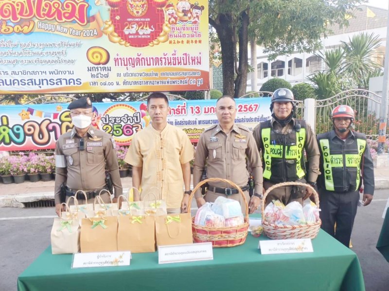 เมื่อวันที่1 มกราคม 2567 วลา 07.00 น. พล.ต.ต.สุระพรรณ นาทวรทัต ผบก.ภ.จว.สมุทรสาคร มอบหมายให้ พ.ต.อ.พิเชษฐ์พงศ์ แจ้งค้ายคม ผกก.สภ.เมืองสมุทรสาคร ว่าที่ พ.ต.ต.สุจิน เสนาสนะ สวป.(ชส.) สภ.เมืองสมุทรสาคร พร้อมชุดมวลชนสัมพันธ์ สภ.เมืองสมุทรสาคร ร่วมกับหัวหน้าส่วนราชการ พ่อค้า แม่ค้า และประชาชน ร่วมพิธีทำบุญตักบาตรเนื่องในโอกาสวาระดิถีขึ้นปีใหม่ ประจำปี 2567 ณ บริเวณวงเวียนน้ำพุ หน้าสำนักงานเทศบาลนครสมุทรสาคร ต.มหาชัย อ.เมือง จ.สมุทรสาคร โดยมี นายผล ดำธรรม ผวจ.สมุทรสาคร เป็นประธานในพิธีทำบุญตักบาตร