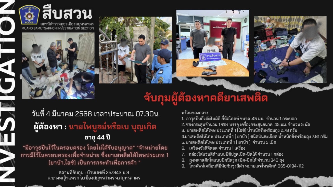 เมื่อวันที่ 4 มีนาคม 2568 ภายใต้การอำนวยการของ พ.ต.อ.พิเชษฐ์พงศ์ แจ้งค้ายคม ผกก.สภ.เมืองสมุทรสาคร ,